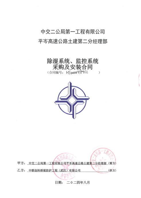 我公司于2024年承接藤州浔江大桥除湿系统(钢箱梁除湿机6套、锚室除湿系统4套、鞍室除湿系统2套、主缆除湿系统2套、监控系统1套)