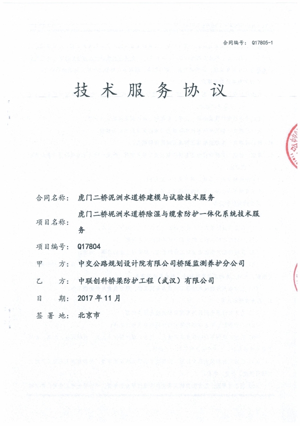 我公司与中交公规院合作,于2017年11月获得该项目的缆索防护建模与实验技术服务合同、主缆除湿系统气夹采购合同两个合同。