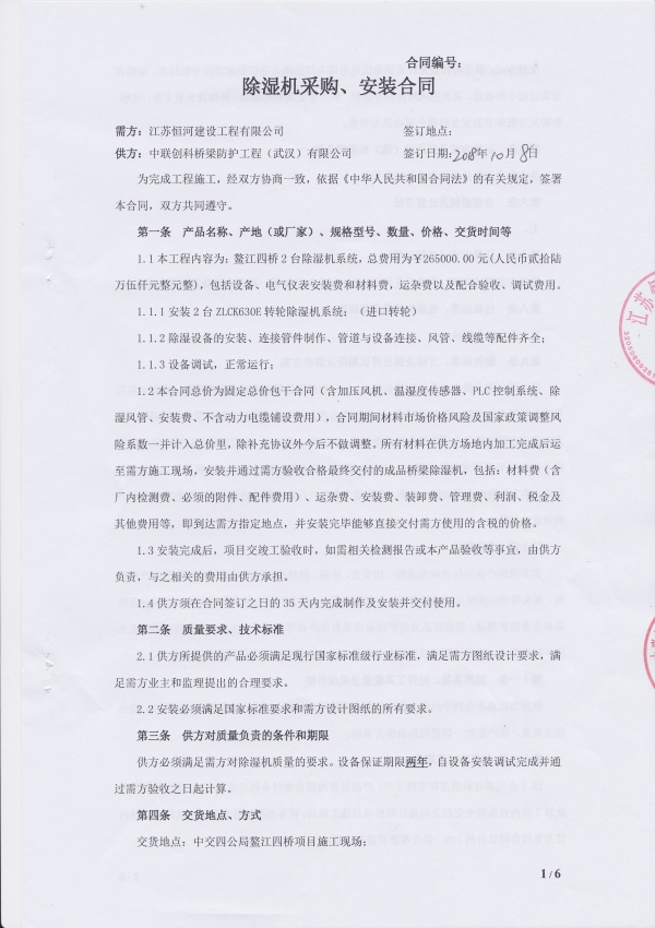 我公司2018年10月获得该大桥索塔的除湿系统供货与安装合同。