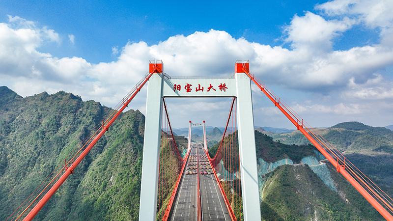 贵州阳宝山大桥起于贵定县新巴镇幸福村石头寨,止于德新镇喇亚村干河,全长1112米,主跨650米,为单跨钢桁架悬索桥,桥面为双向六车道高速公路,设计速度100千米/时。